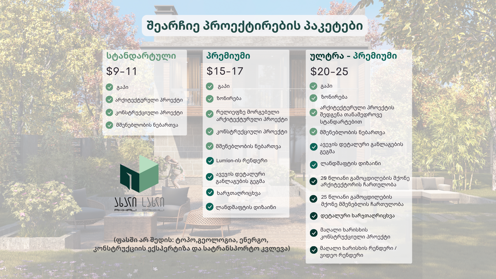 კომპანია ახალი სახლი მომხმარებლებს სთავაზობს პროექტირების პაკეტებს, სადაც შეუძლიათ თითოეული პაკეტის დეტალური აღწერის მიხედვით მიიღონ არჩევან